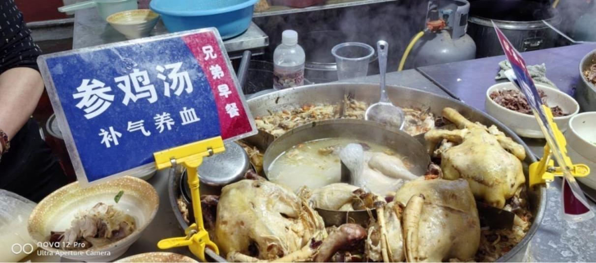 早市上15元一碗的参鸡汤。孟海鹰/摄