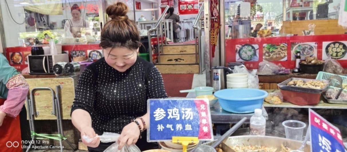 30多岁的范海燕站在摊位背面,麻利地盛起一碗参鸡汤给来宾,还不健忘叮属一句,喝完免费添汤啊!