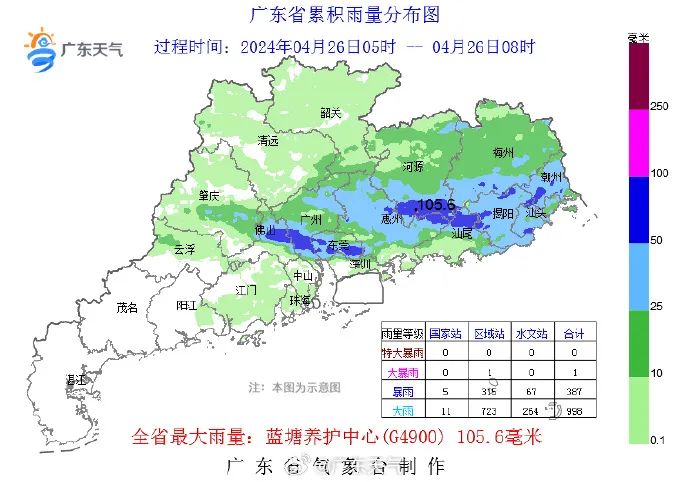 中央局势台4月26日06时发布暴雨蓝色预警:瞻望,4月26日08时至27日08时,福建东南部、广西中北部、广东中东部、台湾岛等地部分地区有大到暴雨,其中,广东东南部、台湾岛西部等地部分地区有大暴雨(100~180毫米)。上述部分地区伴有短时强降水(最大小时降雨量30~50毫米,局地可跳跃70毫米),局地有雷暴大风或冰雹等强对流天气。